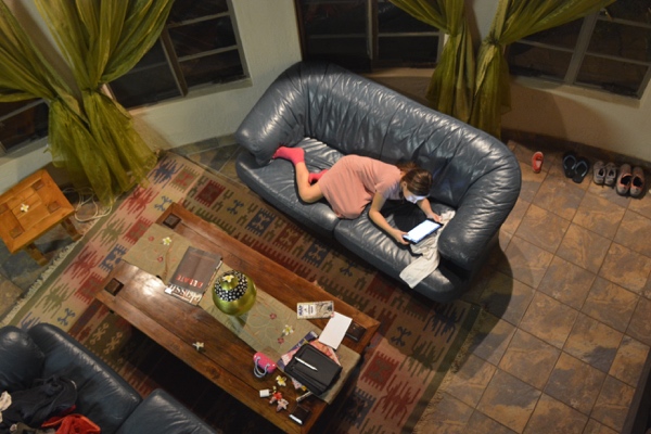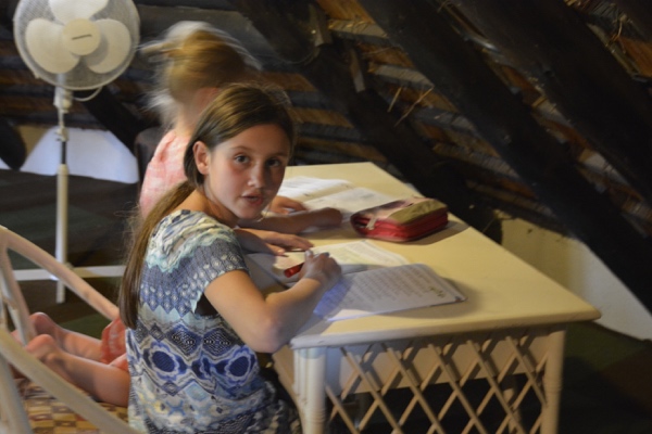 Seit gestern Abend wieder eine völlig andere Welt. Durch die Drakensberge in unsere Lodge am Blyde River Canyon. Die letzten sechs Kilometer geht es durch dschungelartige Landschaft über eine schmale rotstaubige Schotterpiste. Überall Schilder mit der Aufschrift „Danger, wild animals“. Endlich kommen wir an das erste Gate. Dann das zweite. Und haben unsere afrikanische Lodge erreicht. Zebradecken, duftende Blüten überall- Safarifeeling obwohl wir noch gar nicht in einem Nationalpark sind. Seltsame Vogelstimmen (ich suche den Lautsprecher im Baum, finde aber keinen….). Im Fluss beim Pool direkt vor unserem Eingang sollen Krokodile und Nilpferde schwimmen. Helen möchte sie gerne füttern. Davon haben wir ihr abgeraten… Antonia will schreiben. Macht sich zuerst Notizen, dann tippt sie bis spät abends alles ein. (Siehe Foto). Und führt erste Gespräche auf Englisch. Außerdem hat sie erste Lektion Deutsch heute absolviert. Morgen ist Mathe dran. -26Grad im Schatten. Eindrücke einsaugen. Gesunden. Genießen. Reisen- wir fangen langsam an einzutauchen in dieses wunderbare, seltsam andere Leben.