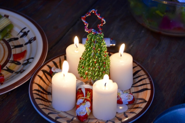 Hier aber muss grad nix. Und das ist – herrlich. Ziemlich fantastisch sogar. Kein Weihnachtssehnsuchtsschmerz. Im Gegenteil. Unser „Baum“ stammt aus dem Township, von Hand gefertigt aus Draht mit Plastikperlen. Und winzig. Die Parodie der üppigen Nordmanntanne. Dazu vier Minikerzen. Und ein paar Geschenke gibt es auch. Die hat der Weihnachtsmann tatsächlich auf der Terrasse hinterlegt. Als ob er wissen würde, dass wir draußen feiern.