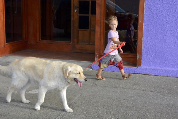 Ein Golden Retriever, der es den Mädels angetan hat.  Liebe auf den ersten Blick. Kaum sind wir angekommen im Hostel, fragen die Mädchen eher Spaßes halber, ob sie Breez mitnehmen können auf unserem Spaziergang, als der nette Hostelbesitzer uns sofort eine Leine in die Hand drückt nebst zwei Plastiktüten falls Breez unterwegs mal ein großes Geschäft machen muss…und überlässt uns seinen Hund. Und dabei hatten wir gerade  eingecheckt….