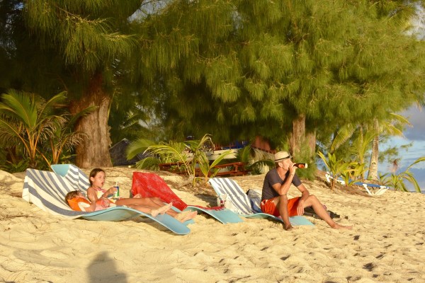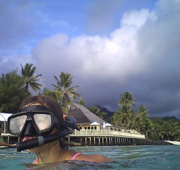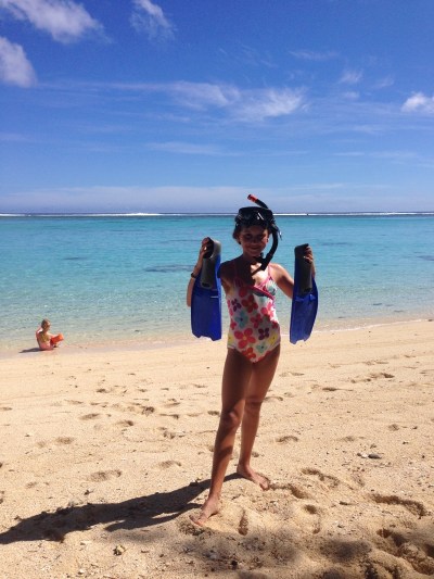 Seitdem wir in der Südsee angekommen sind, bestehen unsere Tage aus: schnorcheln. Kajak fahren. Im Muschelsand buddeln. Im Pool baden. Unterricht und Referat vorbereiten für Antonias Klasse. Und zwischendurch etwas zu sich nehmen. Vor allem Flüssiges. Viel mehr is nich drin. Muss aber auch nicht. Ist schließlich Südsee. Zum Glück haben wir nicht den Stress der anderen, die mit einem weddingplanner durch die Gegend turnen. Achtzig Prozent der Unterkünfte auf den Cook Islands haben nur Honeymoonvillas oder eben Doppelbetten. Kinder werden hier gemacht, vielleicht, aber möglichst  nicht mitgebracht. Die Unterkünfte jedoch, die Kinder akzeptieren, so wie unsere, die immerhin zwei family-cottages anbietet, haben denn auch alles was das Kinderherz begehrt: einen Pool, ein Riesentrampolin, Strandspielzeug und bei uns gibt es auch noch ein paar frei laufende Hühner, einen Hund und zwei Katzen. Für die Mädels eh das Größte. Antonia und ich allerdings haben andere Lebewesen entdeckt, die uns geradezu süchtig machen: Fische.