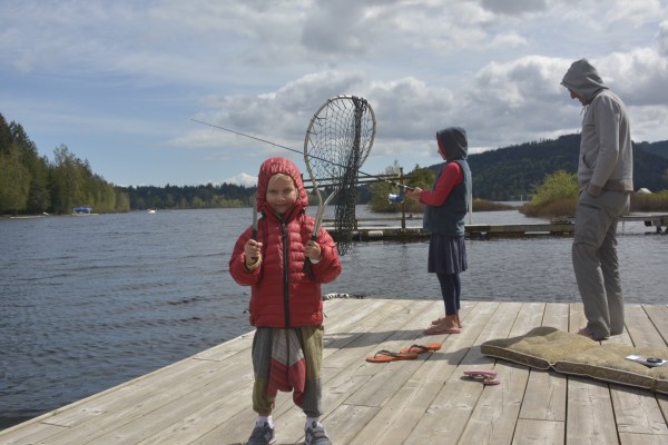 Als wir Vancouver City verließen, goss es in Strömen. Und es war saukalt. Wir hatten Glück, denn angeblich soll es hier jeden Tag regnen, wurde uns gesagt. Es regnete jedoch nur an drei Tagen von vieren. In unserem Haus am See haben wir dennoch tapfer weiter geangelt. Vor allem Frank. Schließlich kam er zu der Überzeugung: die spinnen, die Kanadier, hier gibt es keinen einzigen Fisch im See. Am letzten Morgen beim Frühstück sehen wir, wie ein kleines Boot direkt vor unserem Deck hält. Ein Mann wirft seine Angel aus. Frank lacht: „Kannst nach Hause gehen, Alter. Hier gibts nichts zu fischen. Der See ist tot.“ Zwei Sekunden später zieht der Mann an der Angelschnur und holt einen zwei Hände breiten Fisch heraus. Danach das gleiche Spiel. Wieder ein fetter Fisch, direkt vor unseren Augen. Frank bleibt sein Brötchen fast im Hals stecken. Er rennt raus auf den Bootssteg. Will sehen, wie der Typ es schafft, aus einem See ohne Fische einen nach dem anderen raus zu holen. Und schnell wird klar: Es liegt an dem Köder. Seiner ist filigraner. Jetzt sind wir alle auf dem Bootssteg und bekommen eine kleine Lektion zum Thema Angeln. Leider müssen wir los, unsere Fähre nach Vancouver legt bald ab.